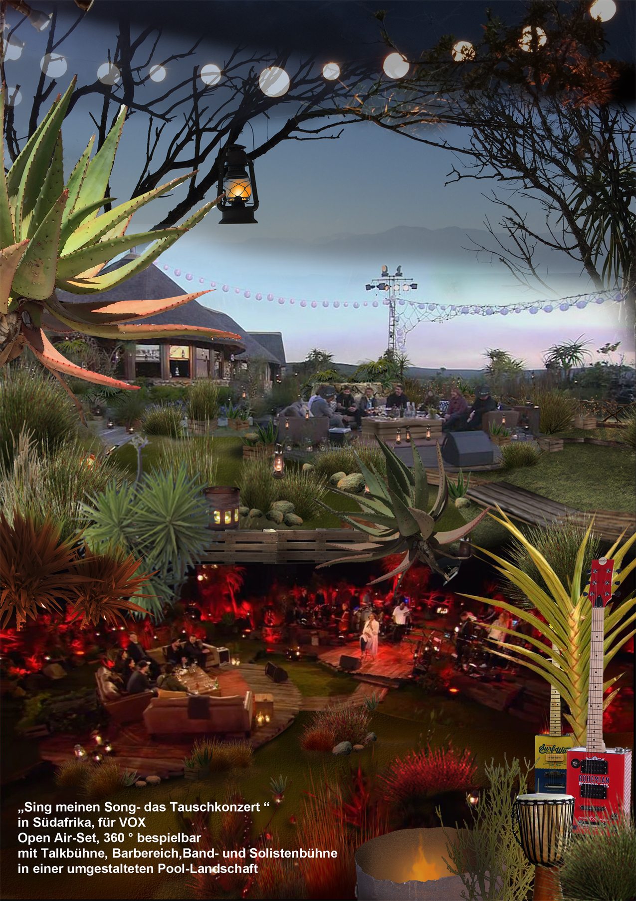 "Sing meinen Song- das Tauschkonzert " in Südafrika, für VOX Open Air-Set, 360 ° bespielbar mit Talkbühne, Barbereich,Band- und Solistenbühne in einer umgestalteten Pool-Landschaft